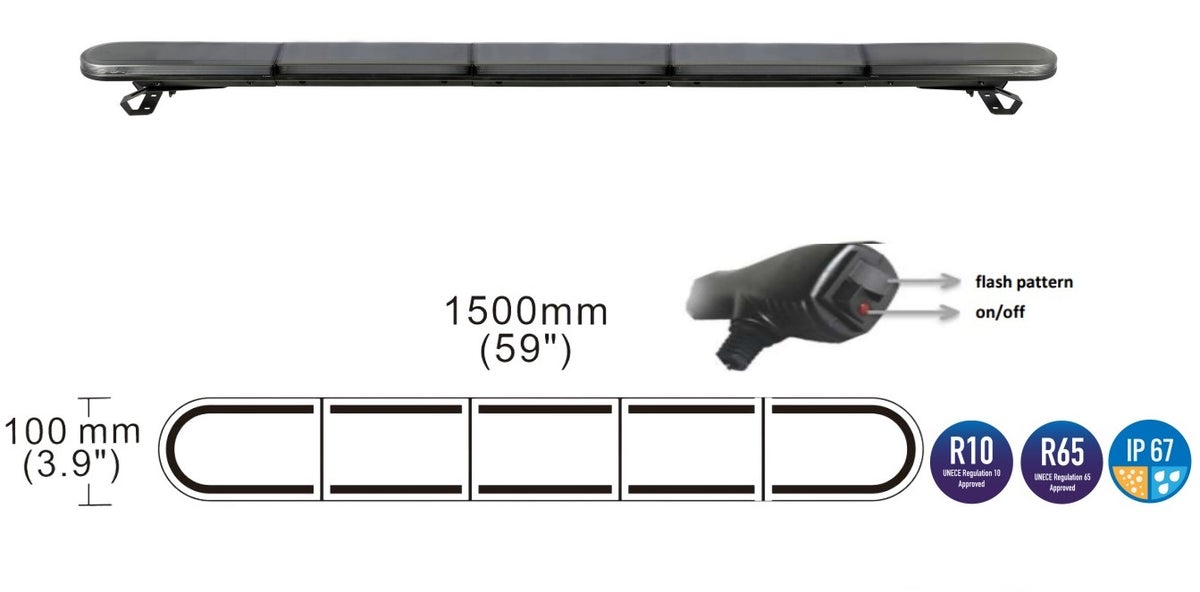 Tehokas ja tyylikäs tummalla optiikalla varustettu 59" E-hyväksytty TruckLed Dark majakkapaneeli. Paneeli toimii 12-24V jännitteellä ja siinä on useita erilaisia välkkymismoodeja. Soveltuu raskaaseen kalustoon, työkoneisiin, yms ajoneuvoihin. Kiinnitys tapahtuu pohjaan laitettavien jalkojen avulla jotka on helppo säätää oikeaan kohtaan. Paneeli saa virtansa 12-24V ulostulosta ja varoitusvalot saa helposti päälle/pois keinukytkimestä ja toisesta keinukytkimestä saa valittua erilaisia välkkymisohjelmia.